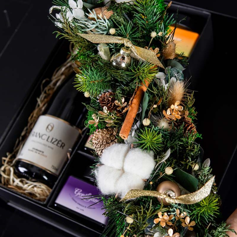 1x Kvetinová dekorácia s ihličím a vianočnými ozdobami